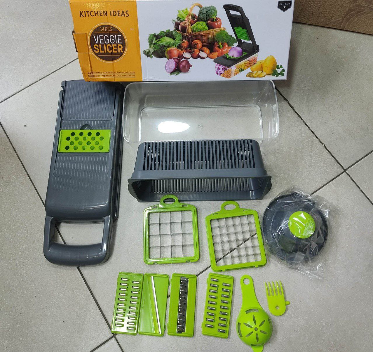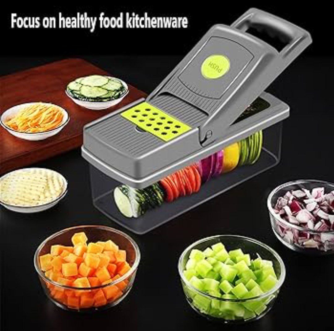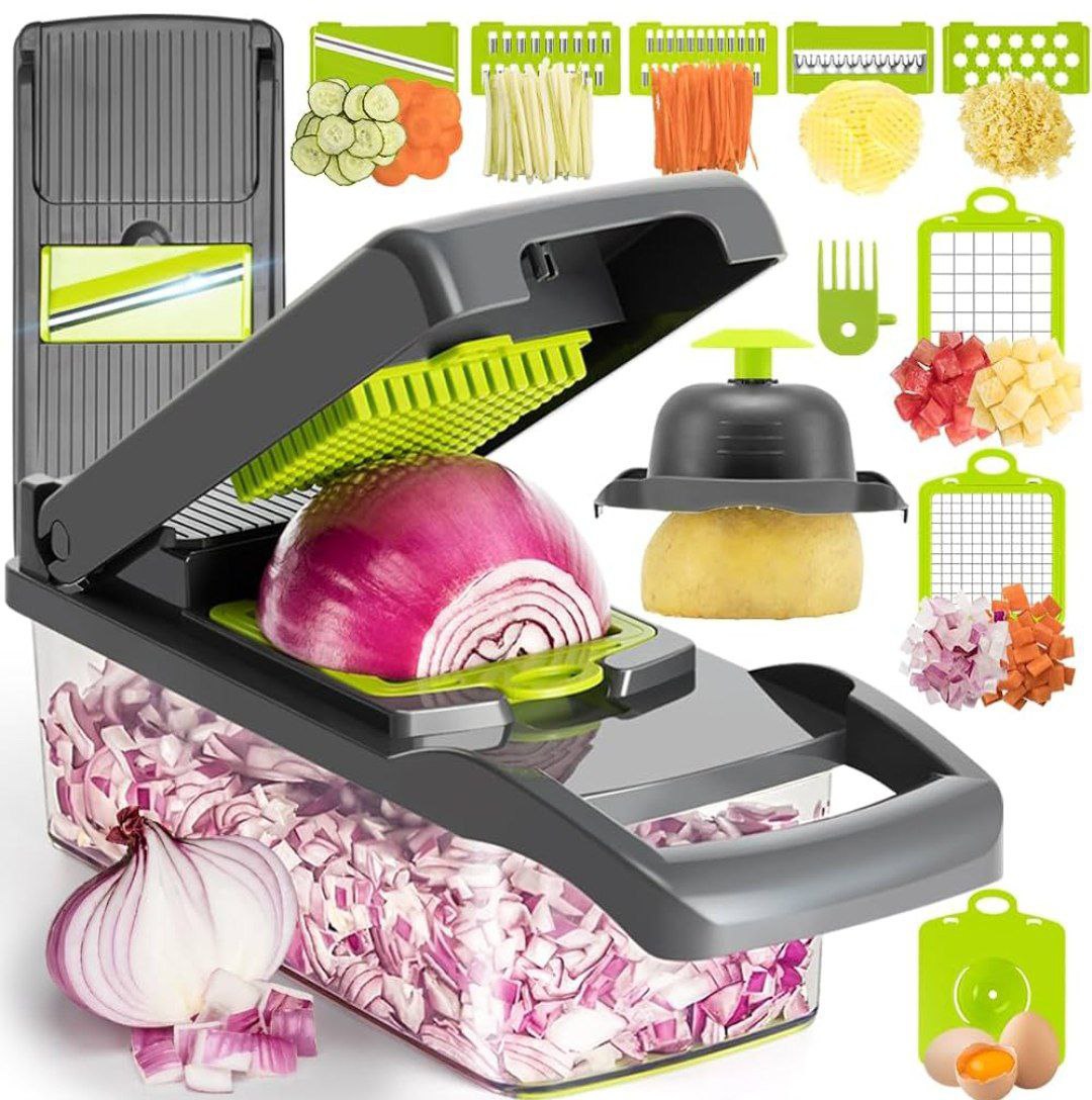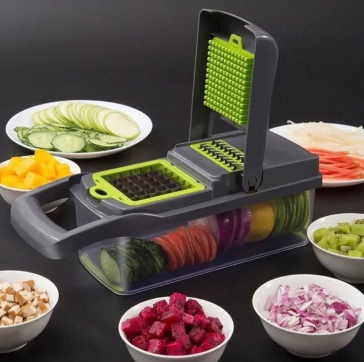 المنتج الموضح في الصورة هو قطاعة ومبشرة خضروات وفواكه متعددة الوظائف، وهو أداة مطبخ شاملة مصممة لتبسيط وتسريع عملية إعداد الطعام، خاصة التقطيع والفرم والتقطيع إلى شرائح.