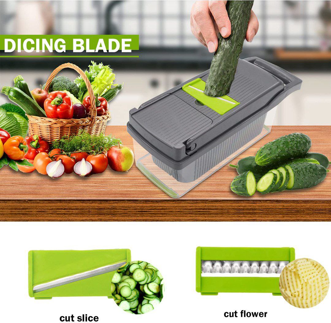 * آلية التقطيع بالضغط: الجزء العلوي عبارة عن غطاء مزود بمقبض كبير. عند الضغط على هذا المقبض، يتم دفع الخضار أو الفاكهة عبر شبكة الشفرات الحادة المثبتة في القاعدة، مما ينتج عنه تقطيع سريع وموحد. الجزء الضاغط الأخضر يظهر على شكل شبكة مربعة.